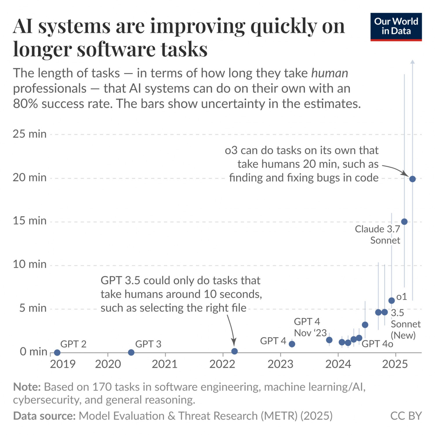 Our World in Data pubblicazione scientifica del Global Change Data Lab, ha recentemente diffuso un interessante grafico di come è cresciuta l'efficienza delle intelligenze artificiali. Ovvero: se un singolo prompt esegue un lavoro, quanto tempo servirebbe a un essere umano per svolgerlo?