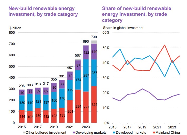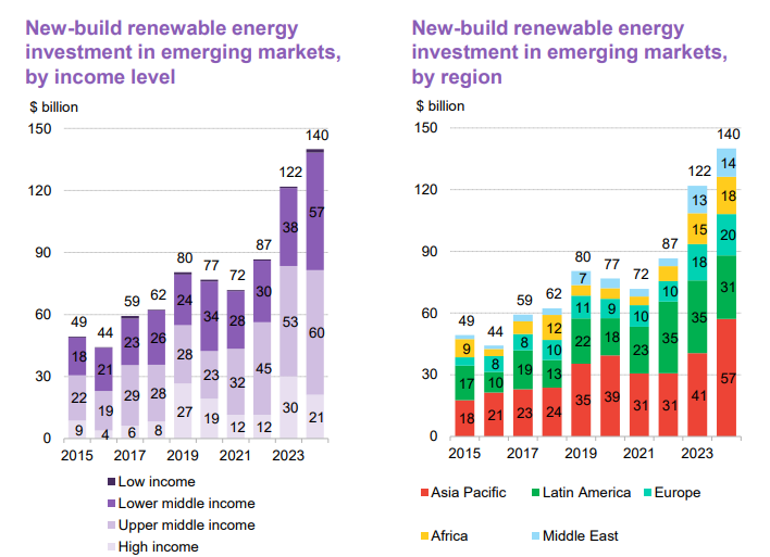 Negli ultimi dieci anni gli investimenti in energia rinnovabile nei mercati emergenti sono passati da 49 a 140 miliardi di dollari. La capacità low-carbon è raddoppiata, ma solo il 18% dei capitali raggiunge i Paesi in via di sviluppo e meno dell’1% quelli a basso reddito.