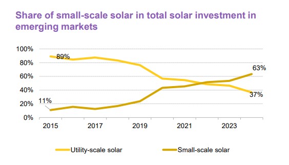 Il fotovoltaico è il principale motore di questa crescita. Nel 2024 ha attratto quasi i tre quarti degli investimenti totali nei mercati emergenti, con una particolare spinta dai sistemi solari di piccola taglia, che rappresentano ormai il 47% del totale contro il 5% di dieci anni fa. Questo boom è stato alimentato da politiche favorevoli alla generazione distribuita (decentralizzata, basata su diverse fonti di piccola scala) e da una maggiore accessibilità tecnologica: la quota di Paesi emergenti con regimi di net metering (scambio sul posto) o altri strumenti di compensazione è salita dal 21% nel 2015 al 73% nel 2025. La crescita delle microinstallazioni ha avuto un impatto diretto sull’accesso all’energia e sullo sviluppo locale, rendendo possibile elettrificare aree rurali e periferiche senza attendere costose infrastrutture centralizzate.