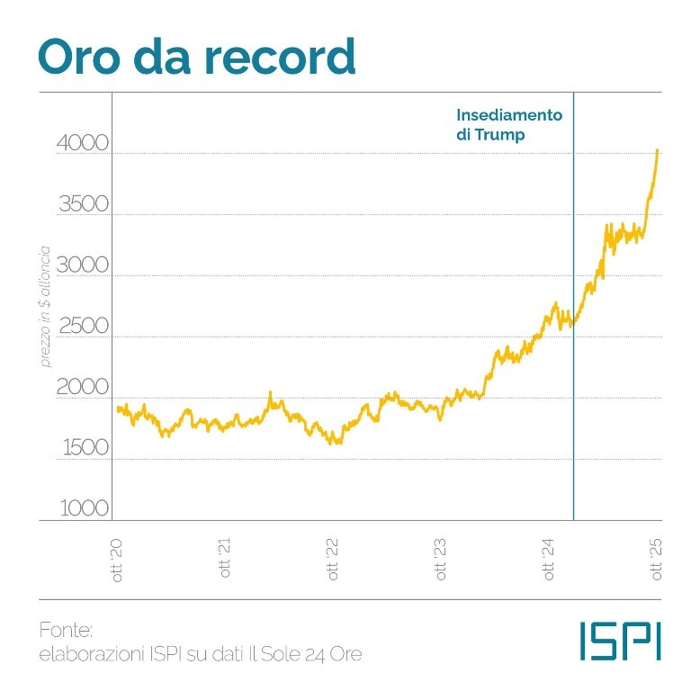 E l’Ispi conferma. Lo scorso 7 ottobre l’oro ha superato lo “strabiliante” prezzo di 4mila dollari l’oncia e salirà ancora. In un momento in cui le borse continuano a gonfiarsi per gli investimenti nell’intelligenza artificiale, c’è chi, “fiutando il pericolo di una nuova dot-com, sta già correndo verso il bene rifugio per eccellenza”.