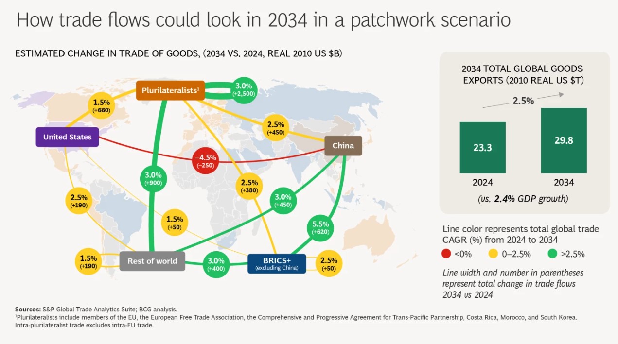 Secondo un’analisi di Boston Consulting Group, il commercio globale potrebbe continuare a crescere del 2,5% annuo fino al 2034, nonostante la frammentazione geopolitica. La sfida? Saper navigare in un mondo multipolare.