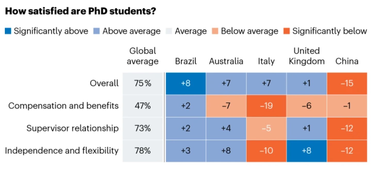 All’estremo opposto la Cina registra il punteggio più basso (60%). Le ore di lavoro, spesso superiori a 80 settimanali, e la competizione per posizioni accademiche limitate alimentano un diffuso malessere. I dottorandi cinesi risultano i meno soddisfatti delle relazioni con i supervisori e dell’autonomia nella ricerca, e solo il 53% afferma di godere del proprio percorso.