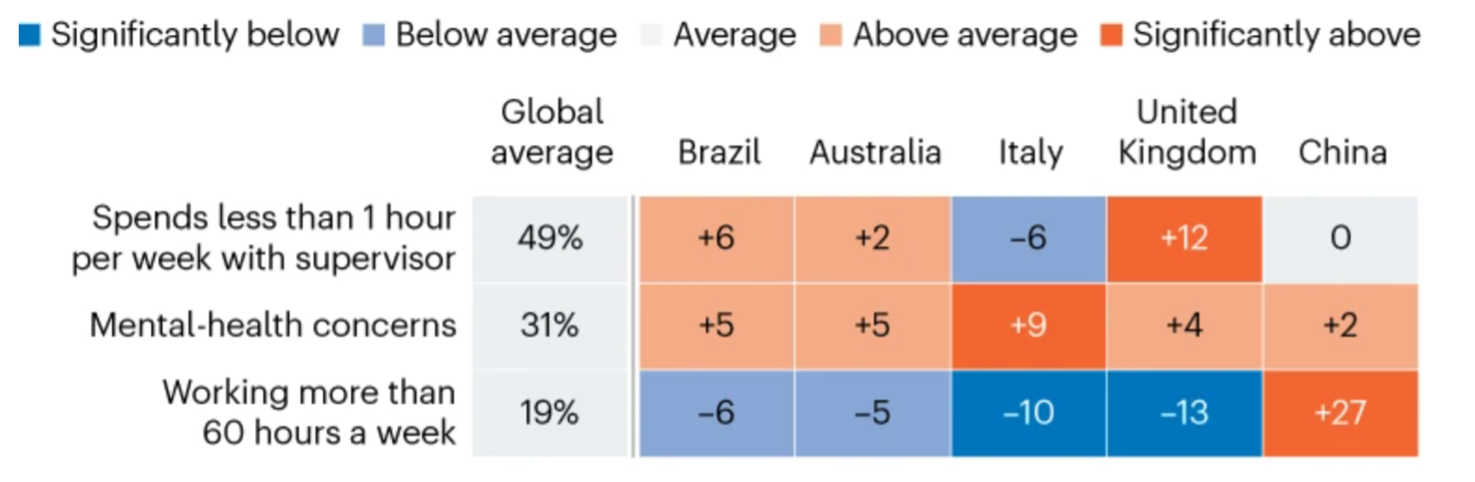 Dietro le percentuali rilevate dal sondaggio, si intravedono tendenze che riguardano il futuro della ricerca. L’indagine mostra che non sono le risorse economiche a determinare la qualità dell’esperienza del dottorato, ma piuttosto le relazioni umane e organizzative a sostegno del percorso. In Brasile l’elevata soddisfazione deriva da un forte sostegno accademico: solo il 15% degli intervistati lamenta carenze di mentoring, contro una media globale del 26%. Anche la solidità delle reti sociali e il senso di appartenenza alla comunità scientifica sembrano compensare le carenze economiche. In Australia, la soddisfazione è altrettanto alta, sostenuta da un buon equilibrio tra vita professionale e personale, una cultura accademica inclusiva e un sistema di welfare accessibile. Il 58% dei dottorandi australiani dichiara un buon work-life balance, contro il 51% della media globale, e il sostegno alla salute mentale risulta significativamente migliore rispetto ad altri Paesi. Tuttavia, il costo della vita e stipendi inferiori al salario minimo nazionale rappresentano un ostacolo importante: il tipico assegno di dottorato australiano è di circa 33.500 dollari l’anno, senza contributi previdenziali.
