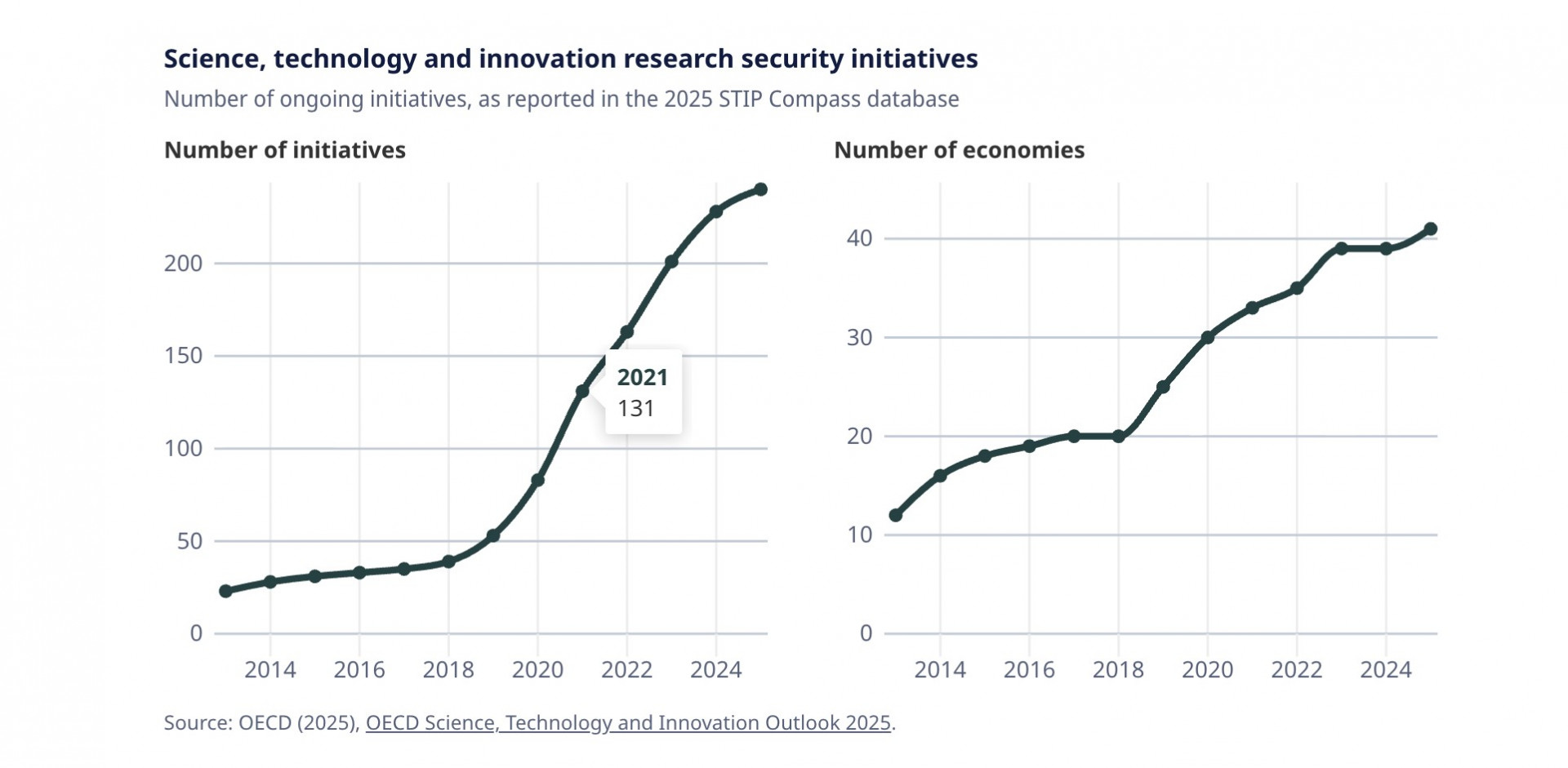 Il documento mostra un forte aumento delle misure di sicurezza per la ricerca, volte a proteggere la ricerca sensibile (tecnologie militari, intelligenza artificiale, crittografia e informatica quantistica, biotecnologie) e a prevenire interferenze straniere. Nel 2025 i Paesi hanno segnalato 250 di queste politiche, quasi dieci volte in più rispetto al 2018. Nello stesso periodo, il numero di Stati che ne era dotato è salito da 12 a 41.