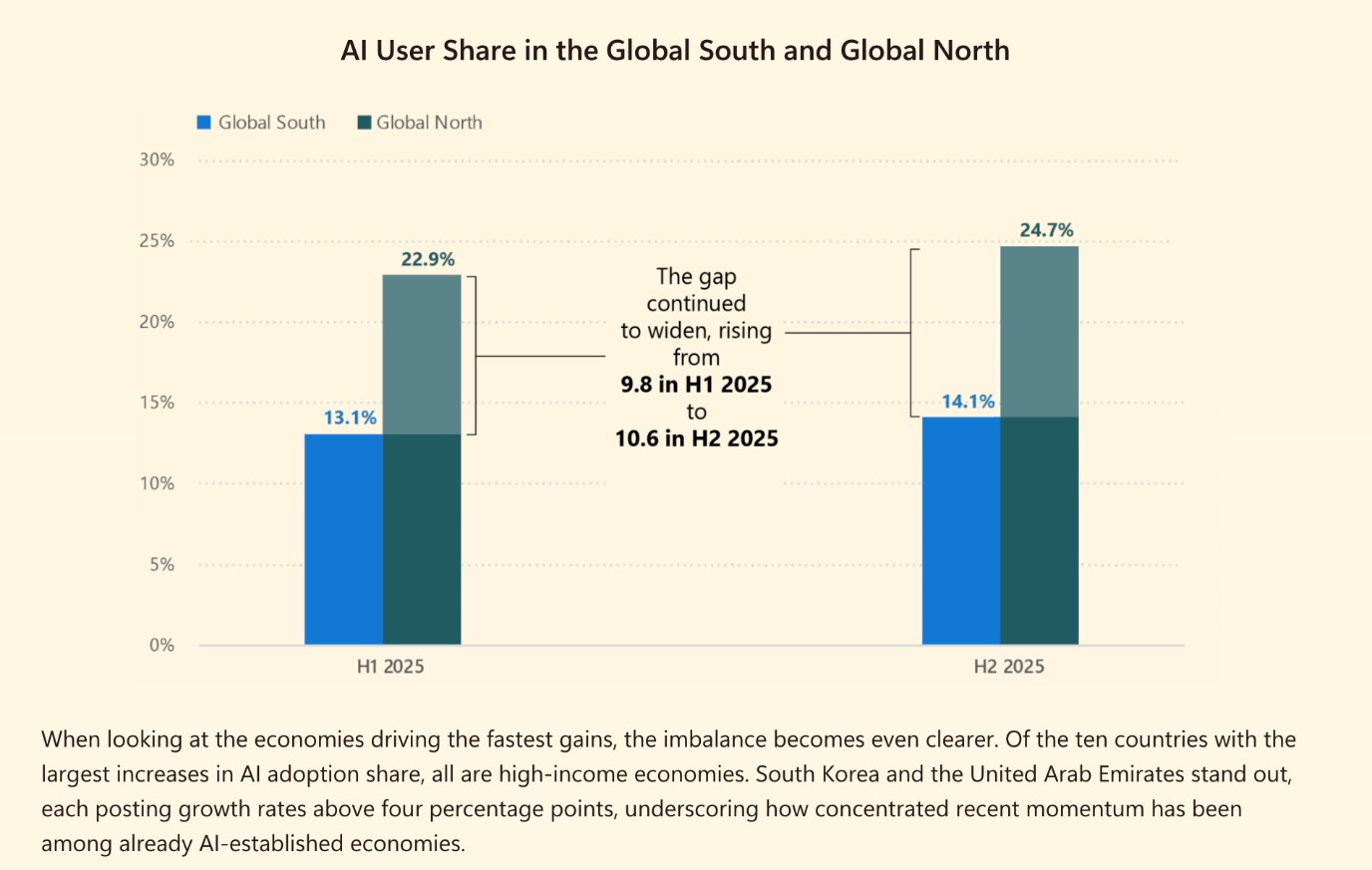 I nuovi dati di Microsoft mostrano che il mondo sta utilizzando l'intelligenza artificiale a livelli record, ma rivelano anche un divario sempre più ampio. L'adozione di strumenti di AI generativa ha raggiunto il 16,3% della popolazione mondiale, rispetto al 15,1% della prima metà del 2025. Oggi circa una persona su sei utilizza l'intelligenza artificiale per apprendere, lavorare o risolvere problemi. Questo progresso è però disomogeneo. Come si vede qui sotto, l'adozione nel Nord del mondo è cresciuta a un ritmo quasi doppio rispetto al Sud, ampliando il divario dal 9,8 al 10,6% dei Paesi. In sostanza, i benefici dell'AI si stanno espandendo, ma non in modo uniforme.