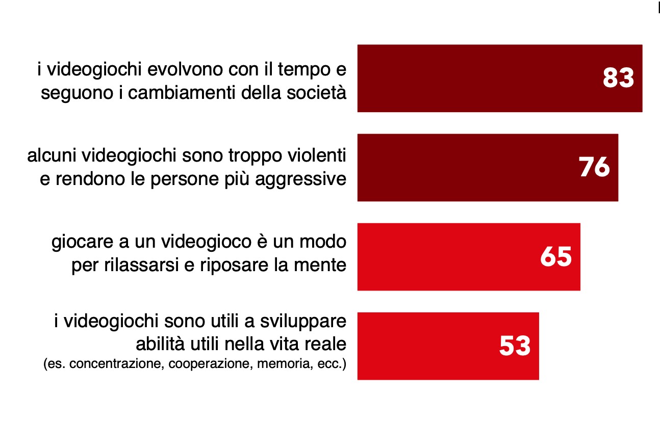 Il Radar conferma inoltre che il tempo libero digitale e i videogiochi rappresentano un terreno di sperimentazione per le nuove generazioni, pur con qualche perplessità. Otto italiani su dieci riconoscono che il settore evolve e si diversifica, ma prevalgono percezioni contrastanti: il 76% ritiene che alcuni giochi siano troppo violenti, mentre il 65% li considera un modo per rilassarsi e il 53% un’occasione per sviluppare abilità utili nella vita reale. I dati evidenziano una differenza netta tra chi gioca e chi no, segno che la cultura videoludica rappresenta un terreno di confronto tra generazioni e un possibile canale per sperimentare nuove forme di apprendimento e socialità. Ma ci sono anche dei coni d’ombra. L’81% degli italiani che non gioca ritiene che i videogames possano alimentare l’isolamento sociale e favorire comportamenti aggressivi e violenti.